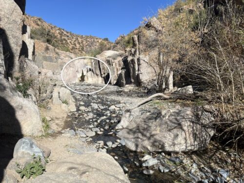 この道は、キャンプ クリーク滝で終わる、露出した峡谷の川床を通ります。トレイルヘッドと川床の間には分岐が複数あり、少しわかりにくいです。広い川床に降りたら左折し、旗と鉱山権利の角柱で左折するまでこの道を進みます。