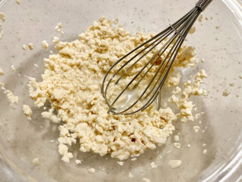 豆腐150gを水切りしてボウルで潰します。調味料を入れて混ぜ合わせます。